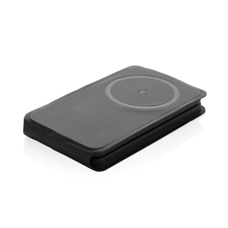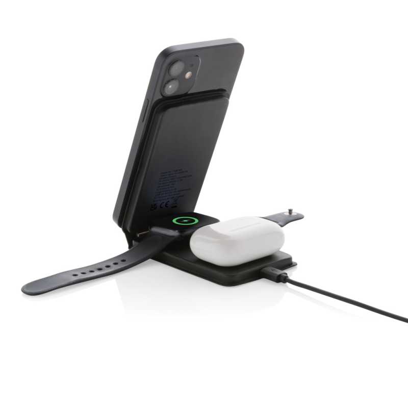 Luxusní skládací bezdrátová nabíječka 3 v 1. Je vybavená magnetickou 15W bezdrátovou nabíječkou pro telefon, 5W pro menší zařízení (např. nabíjecí krabička TWS sluchátek), 2,5W pro chytré hodinky Apple watch. Vyrobené z RCS recyklovaného PU. RCS (Recycled Claim Standard) je globální standard, který umožňuje ověřit použití recyklovaného materiálu v produktu napříč celým dodavatelským řetězcem. Celkový podíl recyklátu dle váhy produktu: 5 %. Včetně 120 cm nabíjecího kabelu z recyklovaného TPE. Výrobek je kompletně bez PVC. Baleno v FSC kraftové dárkové krabičce. Vstup: 9V/3A pro optimální použití. Výstup: telefon: 9V/1,1A, 9V/1,67A (15W); sluchátka: 5V/1A (5W); hodinky: 5V/0,5A (2,5W).