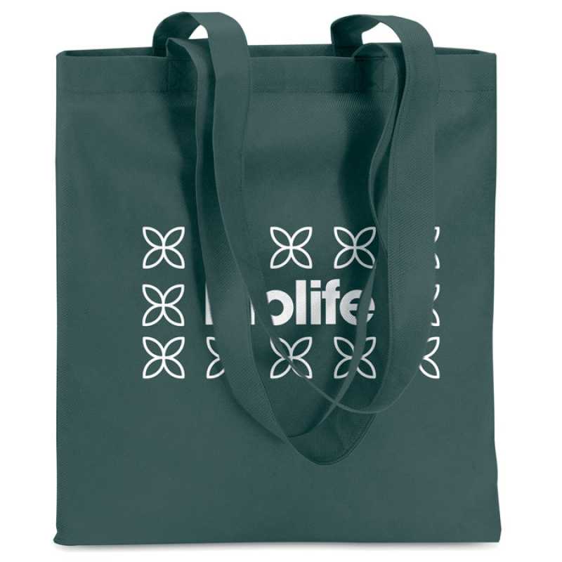 Velká netkaná nákupní taška v gramáži 80 g / m2, v mnoha různých barvách s dlouhými uchy, které jsou připevněny k tašce výrazným křížovým šitím. Rozměry 38 x 0,3 x 41,5 cm. Způsob potisku sítotisk.