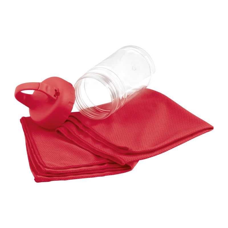 Trendy sportovní ručník v plastovém pouzdře s karabinou pro nejlepší osvěžení při sportovní aktivitě. Velikost ručníku je 79 x 29 cm.