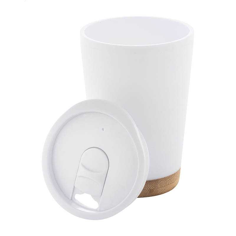 NOVINKA 2025. Dvoustěnný pohárek z PP s korkovým dnem a posuvným uzavíracím víčkem s náustkem z PS a ABS. Objem: 300 ml.
