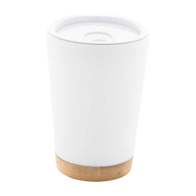 NOVINKA 2025. Dvoustěnný termo hrnek izolovaný PP plastem s víčkem na pití a bambusovým dnem, 260 ml.
