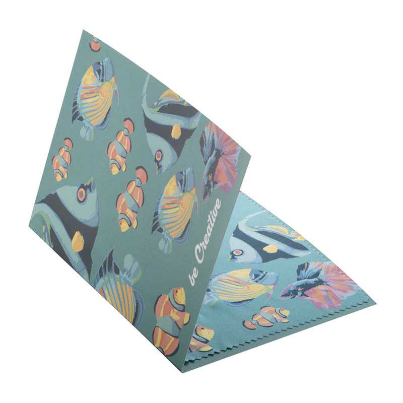 Papírová pohlednice s vlastní grafikou na obou stranách. Vč. čistícího hadříku na brýle ze 100% RPET (175 g/m2) z mikrovlákna se sublimačním potiskem. Cena zahrnuje digitální a sublimační tisk, nezahrnuje tiskovou přípravu. Min. mn.: 100 ks.