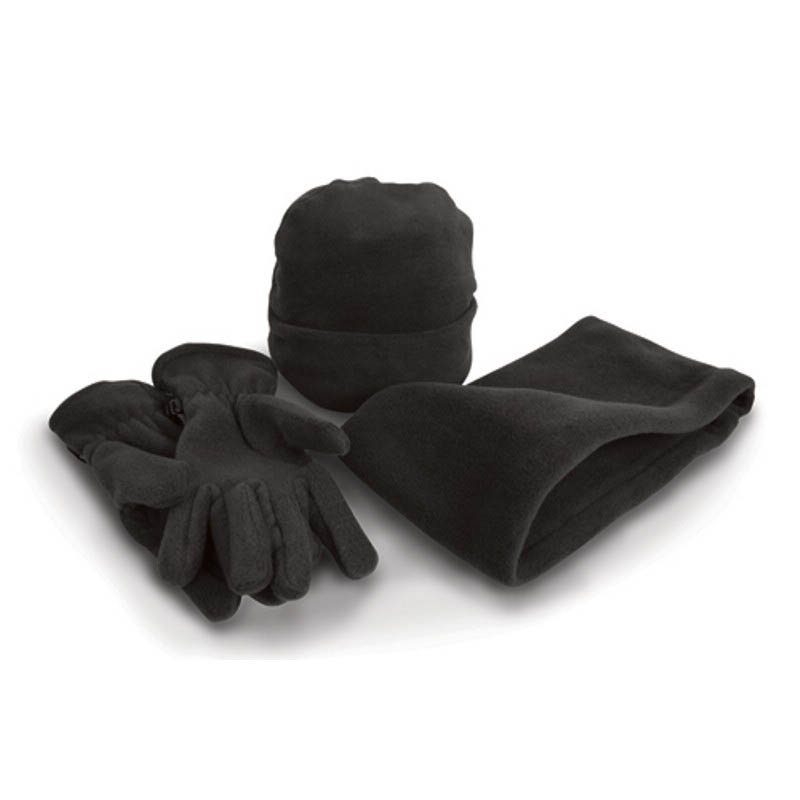 ·200 gsm·100% polyester (fleece) ·Anti-pilling·Elasticated set with gloves, muffler and cap. Značka : RESULT . Materiál : 200g/m2 ; 100% Polyester