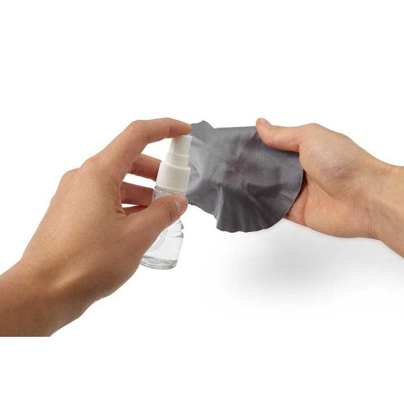 PET lens and screen cleaning spray (30ml) with microfibre cloth. The cloth can be folded into the lid of the container.