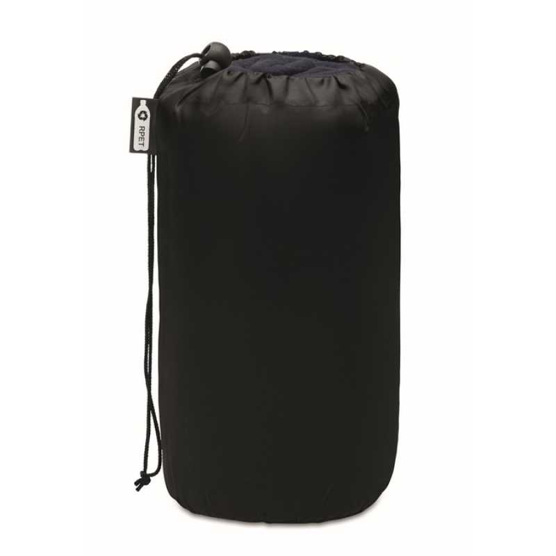 RPET foldable polar fleece blanket. 150gms. PEVA backing. Zippered front pocket. Short handle.