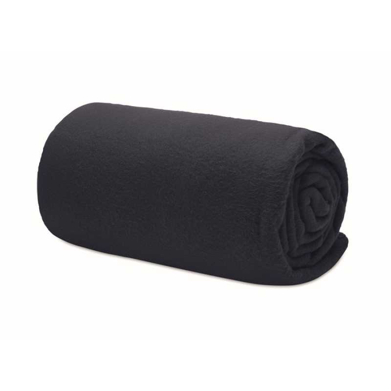 Fleece (165 gr/m2) travel blanket with nylon carrying handle, unfolded size +/- 115 cm x 135 cm.