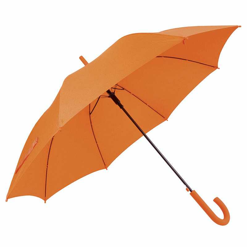 Umbrella with automatic telescopic opening. 190T polyester canopy, fibreglass frame, metal stem, velcro closure and classic curved handle.