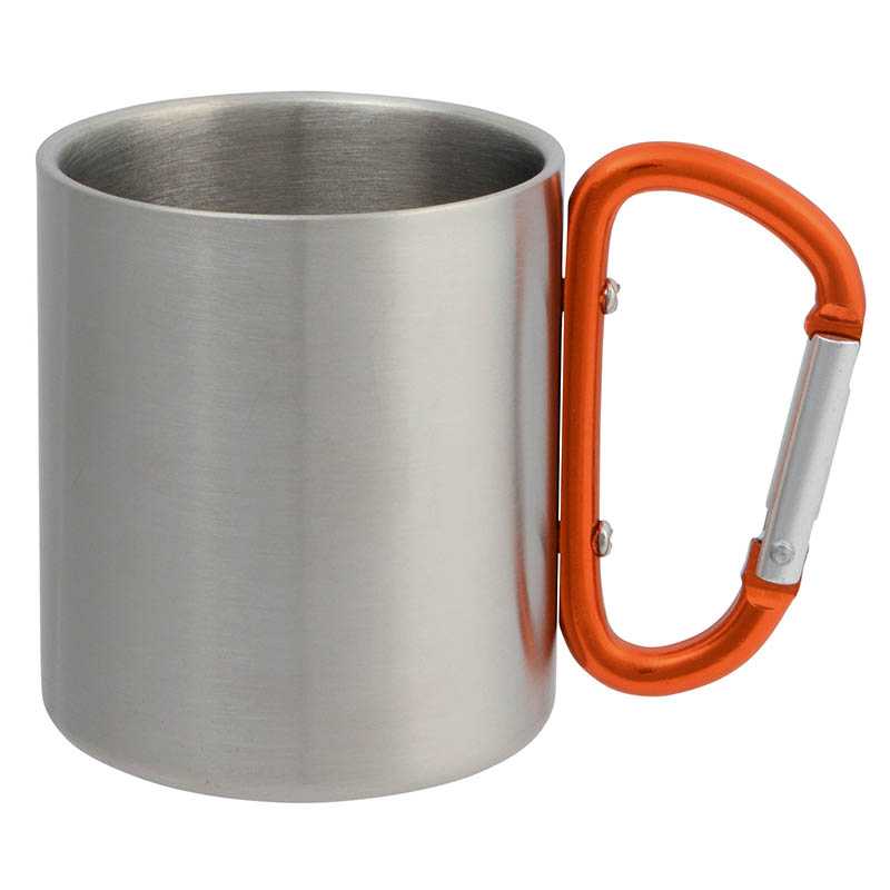 Stainless steel, double walled travel mug (185 ml). The handle functions as a carabiner.
