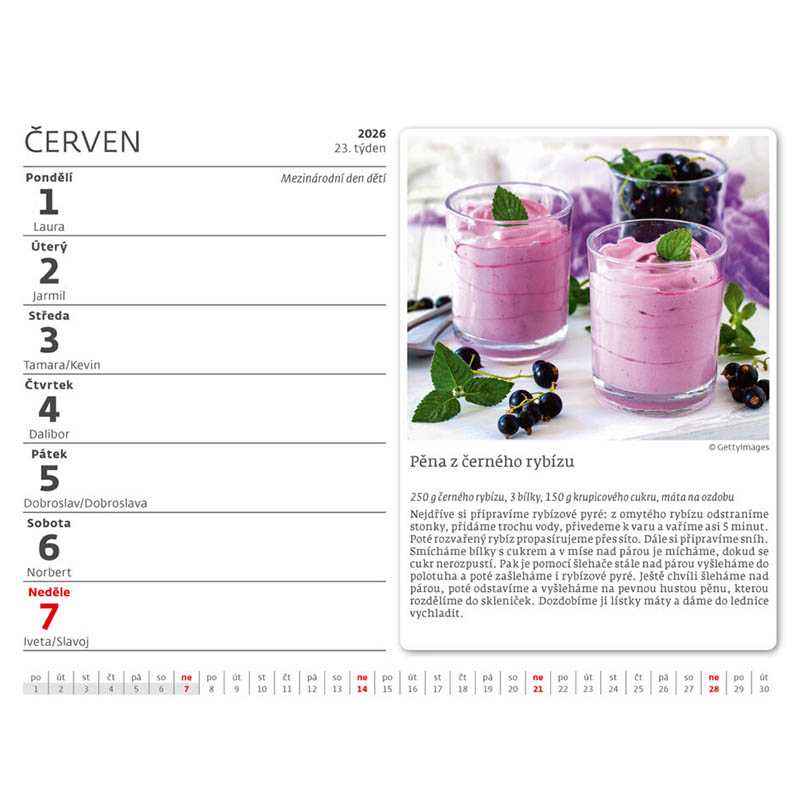 V kalendáři najdete 53 pečlivě vybraných receptů z tradiční české kuchyně. Týdenní kalendárium s prostorem pro poznámky obsahuje také svátky, památné dny, měsíční fáze a přehled na celý rok. Plocha pro potisk: 16,5 x 2,9 cm. Rozsah: 29 listů (oboustranný