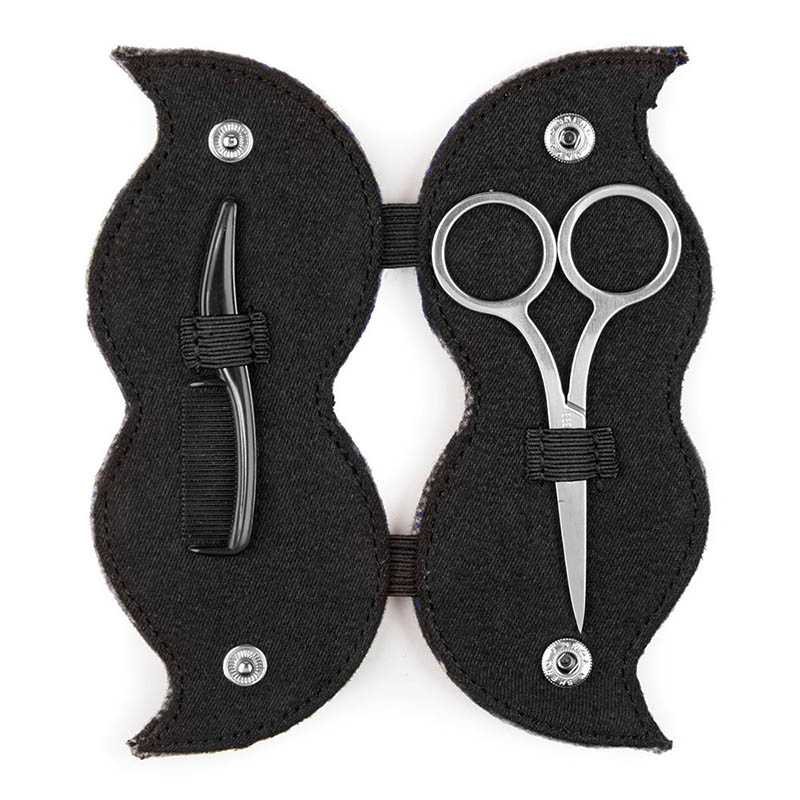 Beard set made of mini comb and stainless steel scissors. In "mustache" in polyester tartan box.