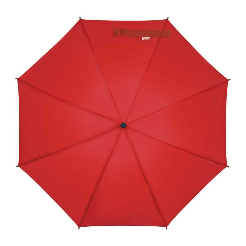 Umbrella with 190T nylon canopy, metallic frame, wooden shaft, handle and velcro fastener.