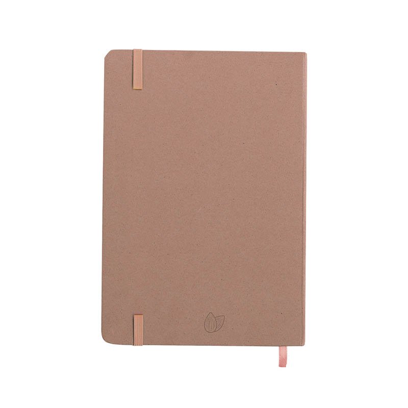 NOVINKA 2025. A5 notepad with hard covers made from fruit. Inside with 80 sheets of single stripe layout, with matching bookmark and elastic band. Available in a variety of kraft finish colours. Includes Fruit Paper logo on back cover. Presented in an individual recycled bag.By mixing waste and residues from the agri-food industry with other recycled materials, a 100% sustainable paper is obtained: fruit paper. Encouraging its use is a contribution to the reuse of materials, and to a greater environmental commitment.