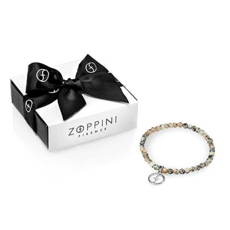 Elastic bracelet with natural stone beads, nickel free, with Feeling Zoppini pendant. Grey. Packaged in an elegant gift box with all-over Zoppini logo ribbon.