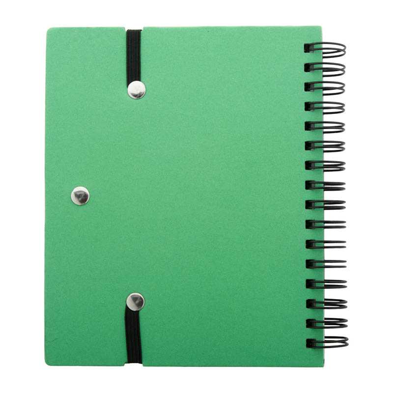 Blok se spirálovou vazbou B6 se 120 stranami bez linek a tvrdými deskami. Poznámkový blok obsahuje držák pera a kuličkové pero ze 100% z papieru makulaturowego. 130 x 177 mm