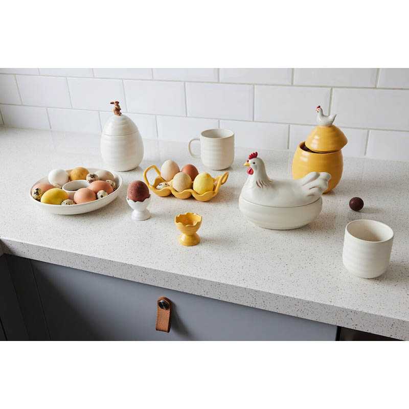 ars are perfect for hiding things you want to keep close by. Ellen hen jar is of course no exception. Easter time we fill it with candy or our favourite cookies, give it away as a gift or keep it for ourselves. We also use it for storage when we want to serve something quick and easy in a nice way. The Ellen jar works great in the kitchen, but also in the bathroom or in the kids’ room. A cute jar in a yellow colour. It’s also available in an off with colour decorated with a bunny instead. Made of stoneware. Delivered in a gift box. Holds 60 cl. This jar for storage is dishwasher safe for easy cleaning. Ellen hen jar belongs to the series Ellen which is a given Sagaform classic with stylish design. The series can be used every day all year round as well as during festivities and our beloved traditions. Material: Stoneware Weight: 600 g Width:11.5 cm; Height:19 cm Color comment: Yellow Technique comment: Hand painted, colour variations may occur.