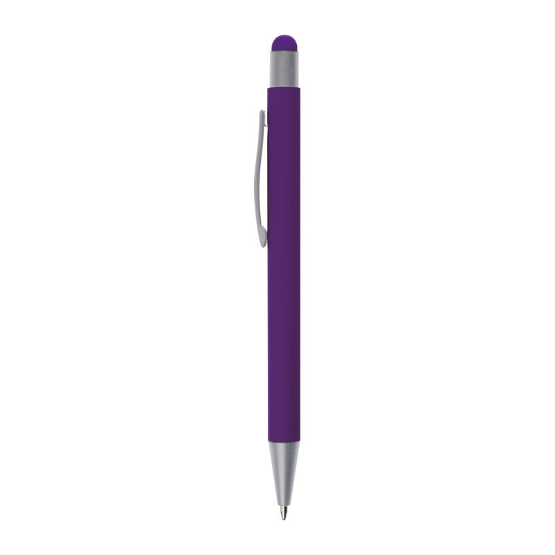 Guľôčkové pero z hliníku s čiernym telom a farebným dotykovým perom (stylusom), modrá náplň. Pero umožňuje aplikáciu lesklého loga vo farbe zodpovedajúcej farbe stylusu.