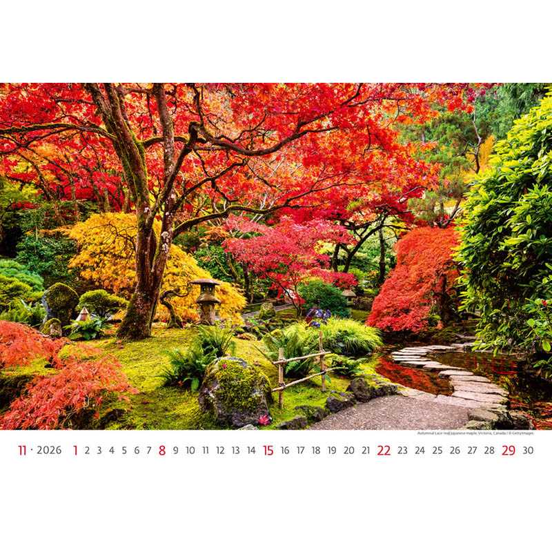 Kalendář Gardens. Formát kalendáře: 45 x 31,5 cm. Kalendárium: měsíční mezinárodní. Rozsah kalendáře: 14 listů. Vazba: Twin-wire (se spirálou). Prostor pro přítisk: 45 x 7 cm