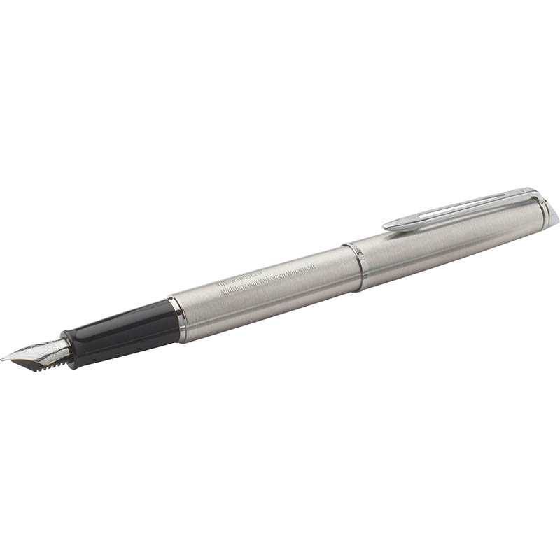 Waterman stainless steel fountain pen. Includes one cartridge with blue ink. Individually packaged in giftbox.