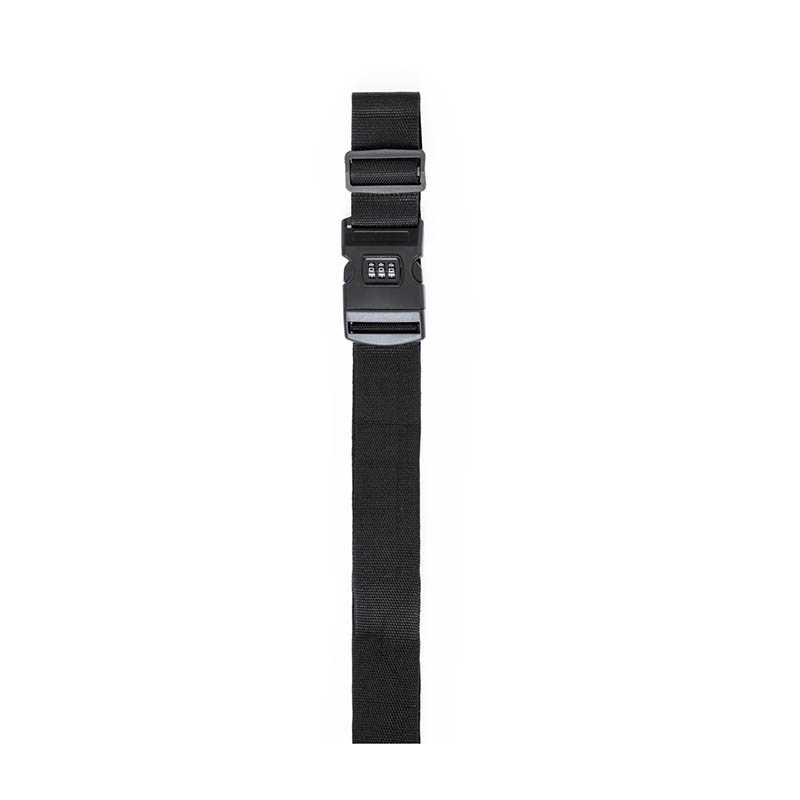 NOVINKA 2025. Luggage strap made of durable polyester. With buckle fastener and 3-digit password lock system. In stylish black color and 2m long. Presented in an individual recycled paper bag.