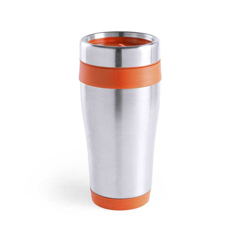Dvoustěnný plastový termo hrnek s víčkem na pití a silikonovým úchopem na zakázku. 400 ml. Min. mn.: 50 ks.