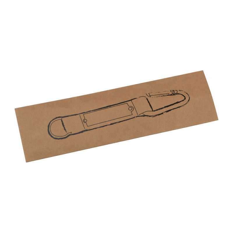 Kovový přívěsek na klíče obdélníkového tvaru s bambusovou vložkou. V kraftové papírové krabičce.