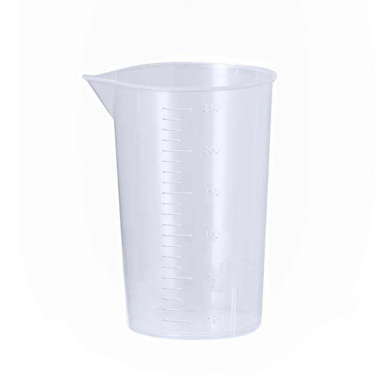 NOVINKA 2025. 250 ml measuring cup made in resistant transparent PP. With side gauge in 10 ml segments and pouring spout to prevent spillage.