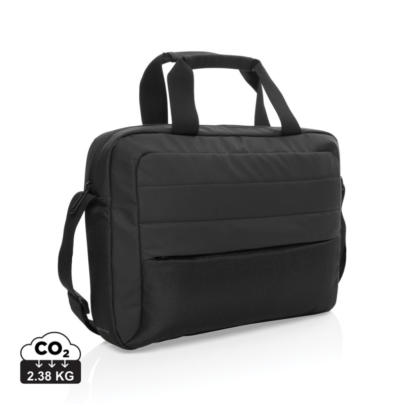 Laptop bag in recycled PET. Paddednotebook compartment. Adjustable andremovable shoulder strap with metal buckle. Trolley attachment system