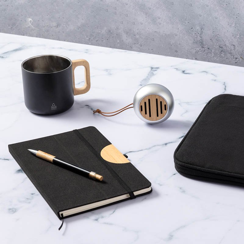 Poznámkový blok o velikosti A5 s obalem z recyklované lepenky, kroužkovou vazbou a očkem pro pero. Obsahuje 70 linkovaných listů kamenného papíru 60 g/m2. Kamenný papír je vyroben 100% bez použití stromů a výrobní proces spotřebovává méně energie ve srovnání s recyklovaným nebo novým papírem z celulózy. Papír je odolný proti vodě a roztržení a má přirozenou bílou barvu (bez nutnosti bělení).
