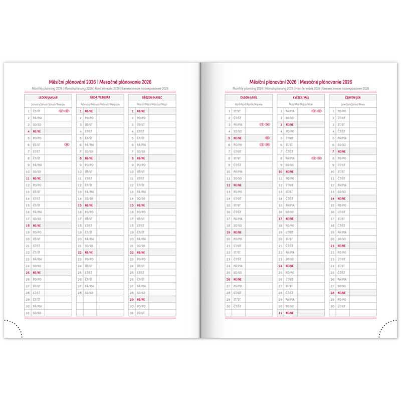Nová řada diářů v moderním designu doplněném o pevnou gumičku a poutko na pero. Týdenní rozložení s česko-slovenským kalendáriem a doplňkovou angličtinou, němčinou, maďarštinou a ruštinou. • kalendárium od prosince 2025• roční plánovací kalen