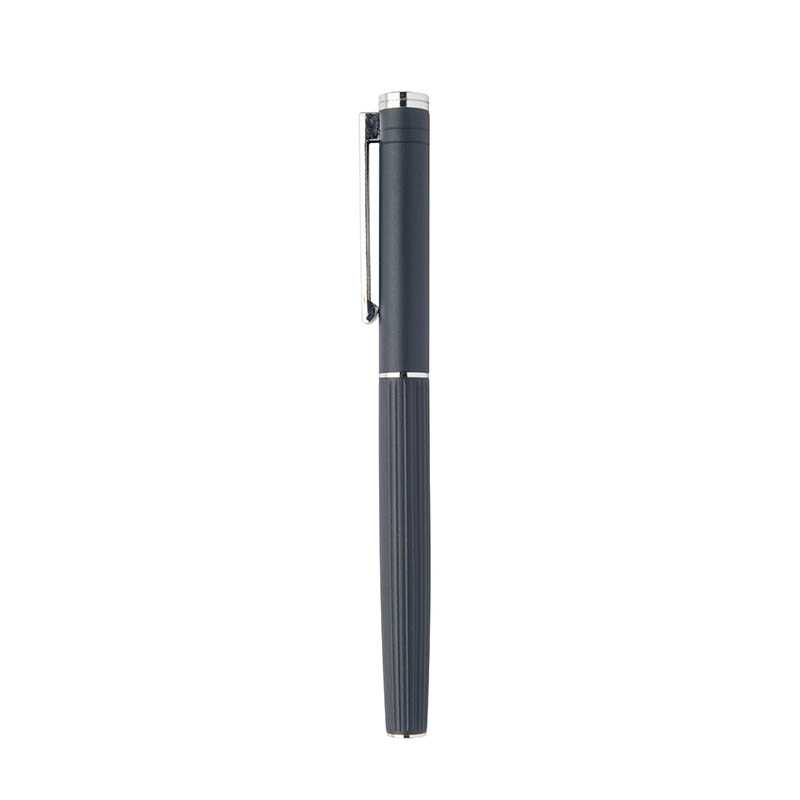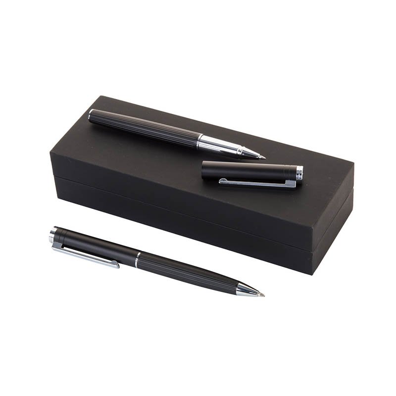 Elegantní sada hliníkového kuličkového pera a rolleru s proužkovaným tubusem. V černé dárkové krabičce, s modrou náplní.