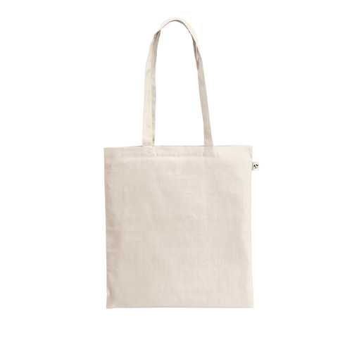 NOVINKA 2025. Taška z 100% recyklované bavlny (140 g/m2), s uchy 65 cm. Recyklovaná bavlna je jednobarevná a nebarvená. Surovina se používá ve své původní podobě a barvě, bez použití barvicích nebo bělících chemikálií, což přispívá k nižšímu dopadu. Pevná barva se získá výběrem recyklované příze se stejným odstínem a mohou se objevit nečistoty a barevné odchylky. 380 x 420 mm