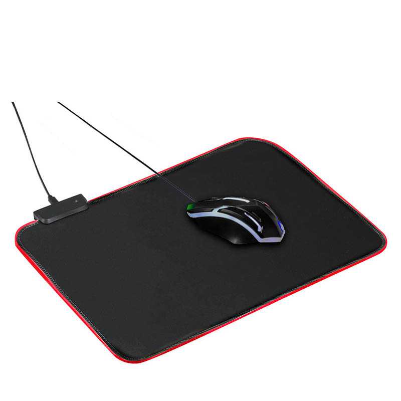 NOVINKA 2025. Gamer mouse pad designed for an immersive gaming experience. Edge equipped with multicolor LED lighting in 7 colors and 13 modes, combining flashing and continuous effects. Made of soft polyester, with a non-slip silicone base that guarantees precision in mouse usage. Includes Type C connection with a 150 cm cable.