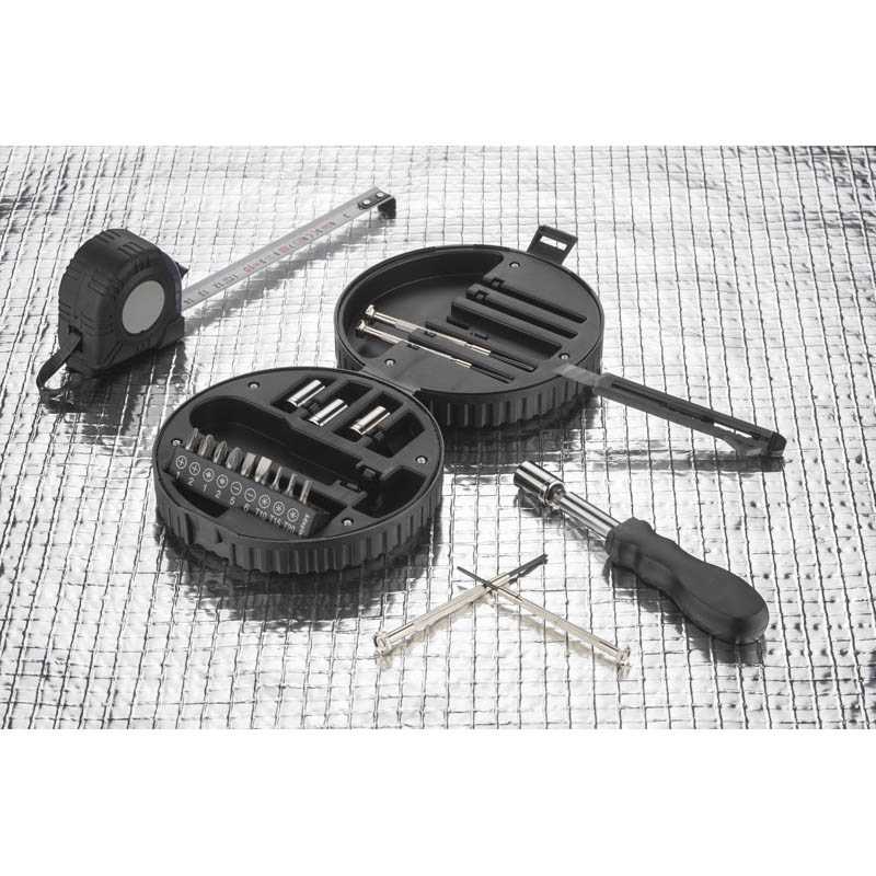 Tool set COMPACTY: storage box in car tyre design, 24 pieces (1 screwdriver, 1 pair of pliers, 10-piece bit set, 5 sockets, 3 hexagon spanners, 2 precision screwdrivers, 1 tape measure)