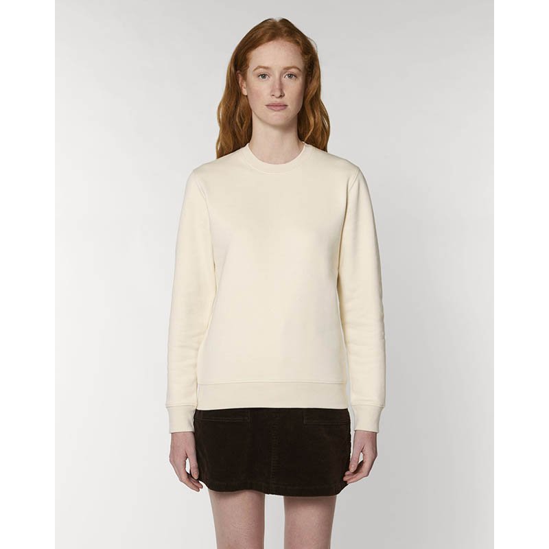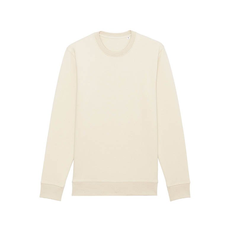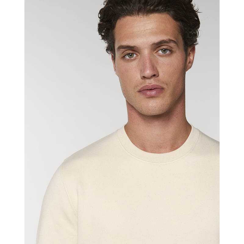 NOVINKA 2025. Set-in sleeves 2x1 Rib at collar, sleeve cuffs and bottom hem Double needles topstitches on all seams Inside herringbone back neck tape Self fabric half moon at back neck Slight shading on seams to give washed look. Garment dyed product, eac