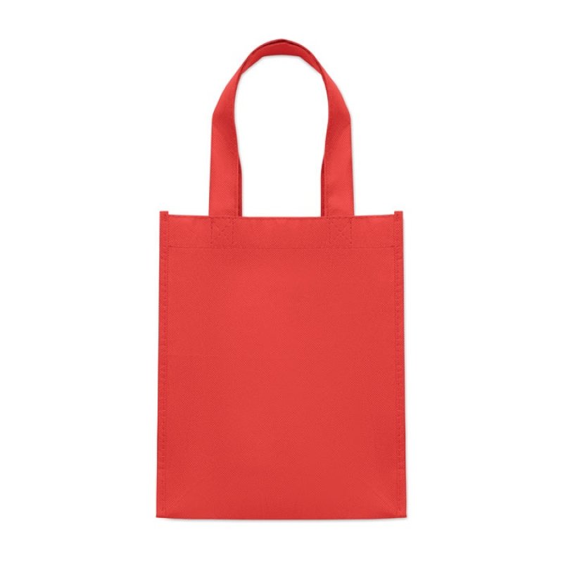 Malá dárková taška z netkané 80g RPET textilie s krátkými uchy a klíny.