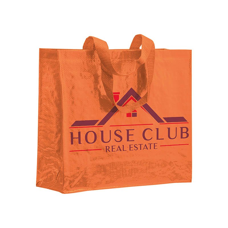 Polaminovaná nákupní taška z netkané textilie v metalické barvě, se středně dlouhými uchy.