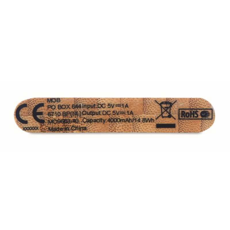 Powerbanka s kapacitou 4000 mAh, kryt z bambusu. Obsahuje konektor typu C. Výstup DC5V/1A. Indikační světlo. Bambus je přírodní materiál, může dojít k mírným změnám barvy, dekorace a velikosti.