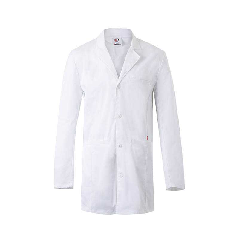 Front closure with snap buttons Shirt collar Back opening Safety stitching on the back Fabric with anti bacterial and liquid repellent treatment Three pockets: 3 patch pockets