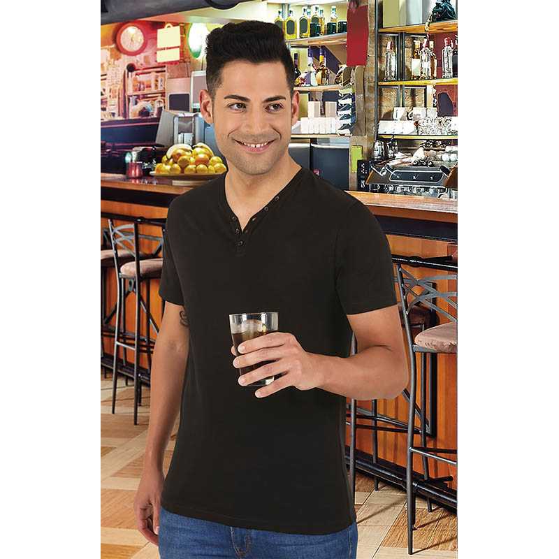 Short Sleeve V-Neck Slim Fit T-shirt with an Adjustable Button Row on the Neckline. Made of 100% cotton Ring Spun knitted fabric for a soft and comfortable feel. Ribbed V-neck with a wide and refreshing button row for optimal comfort and a refreshing feel. Double stitching on neck, sleeves and bottom hem for added strength and durability. An inner herringbone tape on the neck for a superior finish. Suitable marking methods: screen printing, embroidery, transfer printing, vinyl application. Ideal as casual wear.