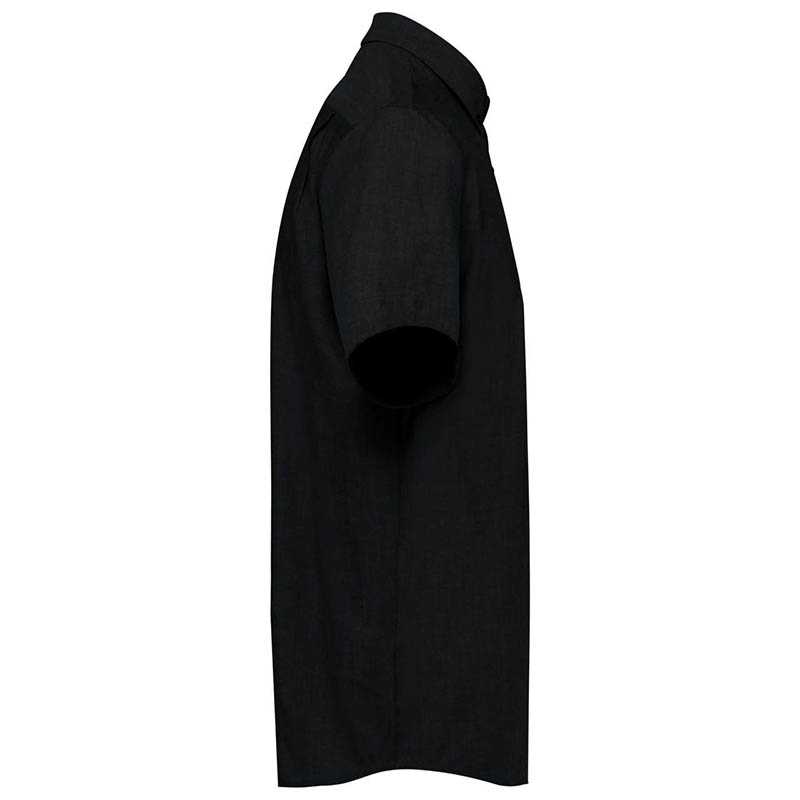 Tkanina.65 % polyester, 35 % bavlněný popelín.105 gsm.Vlastnosti.Vyztužený límec formálního střihu.Levá náprsní otevřená kapsa.Krátké rukávy.Barevné knoflíky na barevných tričkách.Střih na míru.Snadná péče.