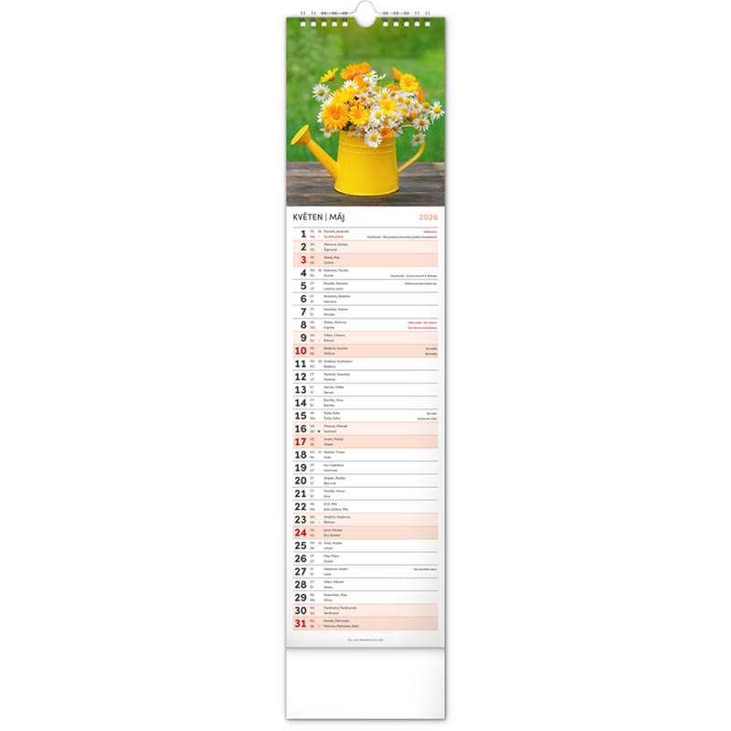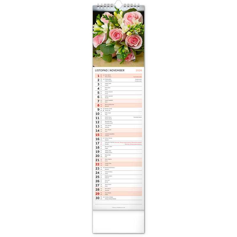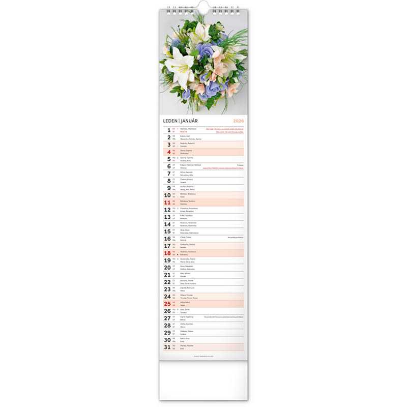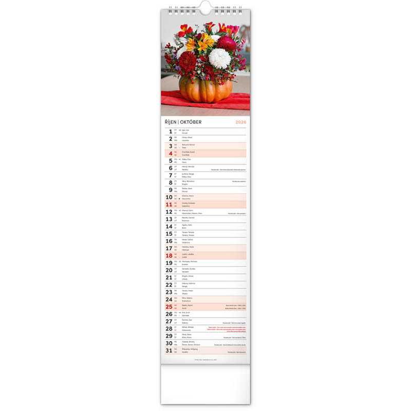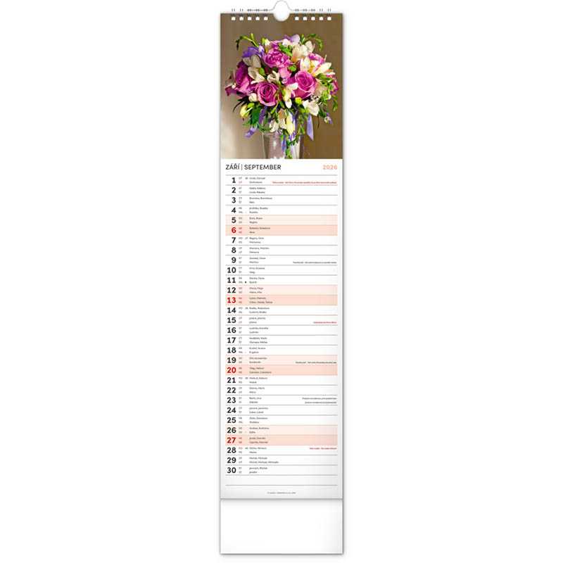 Okrasné květiny a květinová aranžmá na stránkách nástěnného kalendáře v praktickém kravatovém formátu, který se vejde opravdu všude. V česko-slovenském kalendáři je rovnocenně zahrnuta čeština a slovenština, česká a slovenská jména, svátky, památné dny i