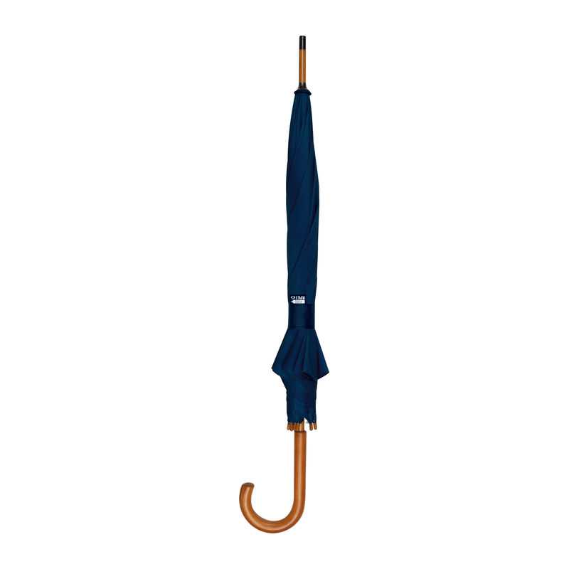 Polyester (190T) automatic umbrella with eight panels. Metal frame and wooden handle.