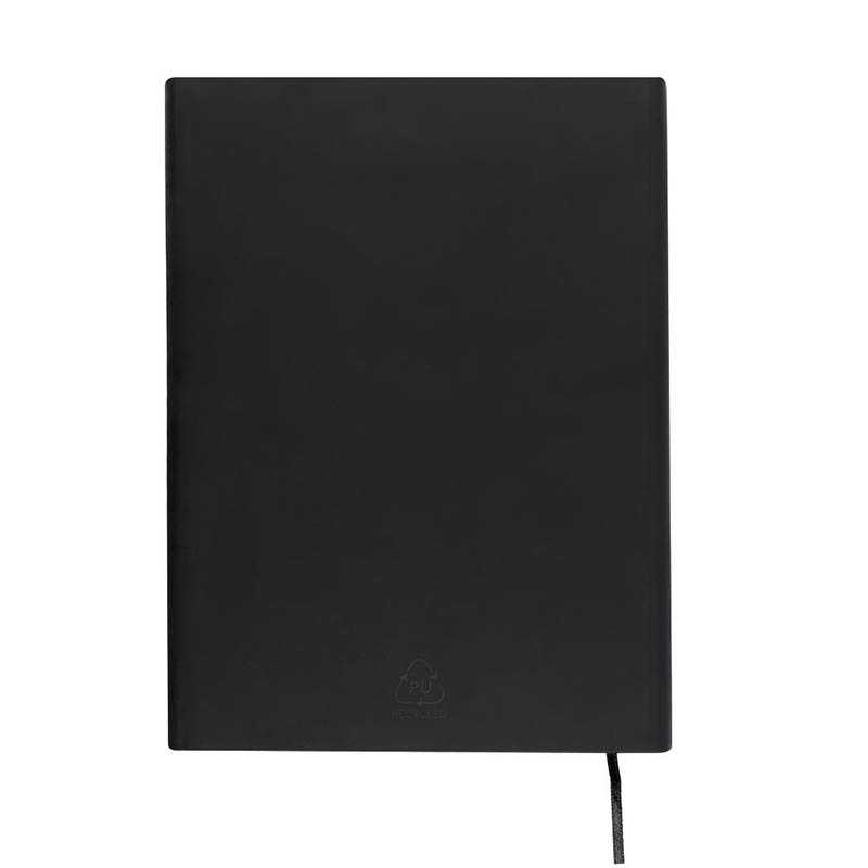 NOVINKA 2025. Notebook and pen set made from recycled PU and recycled aluminum. In elegant matte black with distinguished rose gold finish accessories.Hard covers notepad, made from Recycled PU, with magnetic closure and rose gold trim. With 80 cream coloured pages in single-stripe layout, matching bookmark and pen holder on the inside, plus Recycled PU logo on the back cover.The set is completed by a Recycled Aluminium ball pen in matt black with rose gold accents and metal clip. Twist-action mechanism and blue ink, with Recycled Aluminium logo.Presentation in an elegant black case.The Recycled PU leather stands out for its resistance and elasticity. This recycled and recyclable material is a sustainable option that rescues the fibres discarded in the manufacturing processes, thus minimising the waste of material and contributing to reduce the environmental impact, while keeping its original properties.Recycled Aluminium is a material with almost infinite recycling possibilities, without losing its original properties and consuming less energy in the process.GRS (Global Recycled Standard) certification, guaranteeing the recycled origin of the material used to manufacture the product.