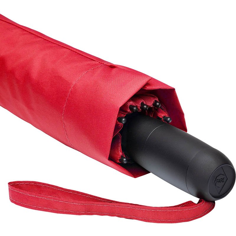 Convenient automatic open/close function for quick opening and closing, high-quality Windproof PLUS system for maximum frame flexibility in stormy conditions, flexible fibreglass ribs with coloured joints, coloured steel shaft, polyester pongee material made of recycled plastics, eco-friendly thanks to original waterSAVE cover material, with waterSAVE® label on the closing strap (with new deliveries), matt/shiny contrasting Soft-Feel handle with colour-rimmed push-button and promotional labelling option