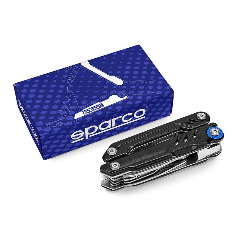 Multi-purpose tool with spring-loaded gripper in stainlesssteel. Includes: pliers, knife, flat and cross-head screwdriver, hacksaw, file, can opener. With locking mechanism. Size closed10,5 cm