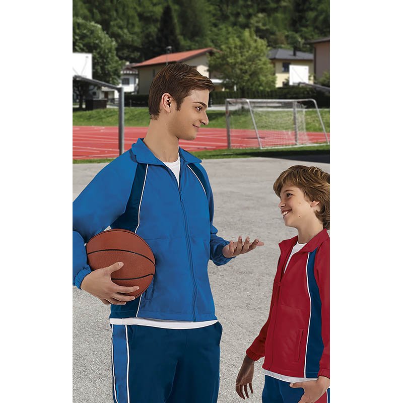 Three-Tone Tracksuit Sports Jacket.Made of dual flock acetate fabric with an inner brushed layer for optimal thermal insulation. Elasticated cuffs for comfortably fitting.Raglan sleeves adorned with white piping and a contrasting colour on the back section.Two slanted zippered waist pockets for a secure and convenient storage.Suitable marking methods: sublimation on white, screen printing, embroidery, transfer printing, badges, shields. Ideal as sportswear and sports school uniforms, pairs well with TOURNAMENT sweatpants, sold separately.