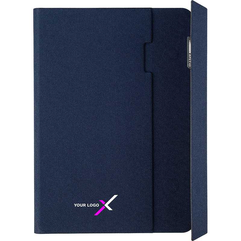 NOVINKA 2025. Složka 300D recyklovaného polyesteru (100% rPET) A4 s elastickým uzávěrem. Interiér s mnoha kapsami, držákem na pero (pero není součástí balení) a zápisníkem s 20 bílými linkovanými listy. Dodáváno v obalu z netkané textilie. 230 x 330 x 50 mm
