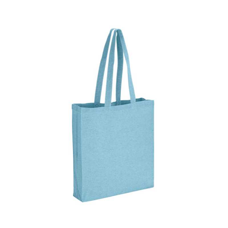 Taška z recyklované bavlny (70 %) a polyesteru (30 % rPET) (140 g/m2), s uchy 68 cm. Recyklovaná bavlna je nebarvená. Surovina se používá ve své původní podobě a barvě, bez použití barvicích nebo bělících chemikálií, což přispívá k nižšímu dopadu. 380 x 410 x 100 mm