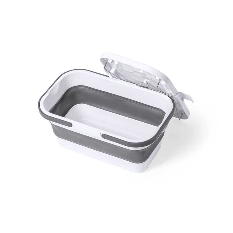 NOVINKA 2025. Foldable, multifunctional picnic cooler basket. Made of resistant PP material in white finish, with a capacity of 16 litres. Lid convertible into a table by means of 2 folding legs, with built-in holders for smartphone/tablet and bottle. Including 2 folding carry handles in grey. Small size when folded, ideal for an easy storage.