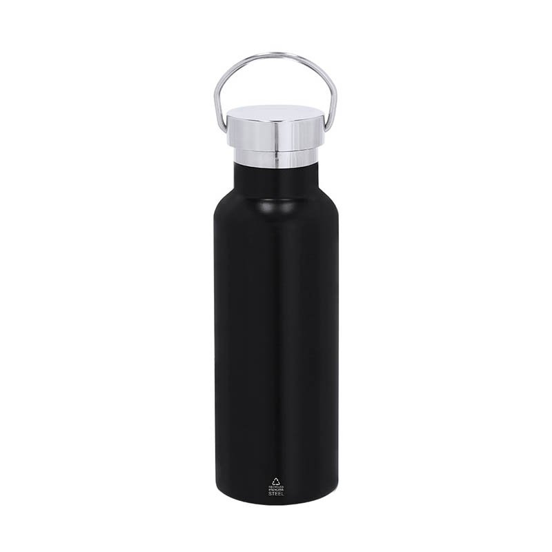 NOVINKA 2025. Thermal bottle in recycled stainless steel with a capacity of 500 ml. With double wall for better and longer-lasting temperature preservation and ceramic-coated interior, suitable for carbonated beverages. Screw cap with a solid stainless steel carrying handle. With a label of Recycled Stainless Steel.Stainless steel is one of the most demanded materials and is found almost everywhere, from daily use products to large constructions. With countless properties, including durability and a high degree of reuse, making it a highly valued alternative in sustainability solutions. Properly treated, it allows for obtaining new resources of infinite use.